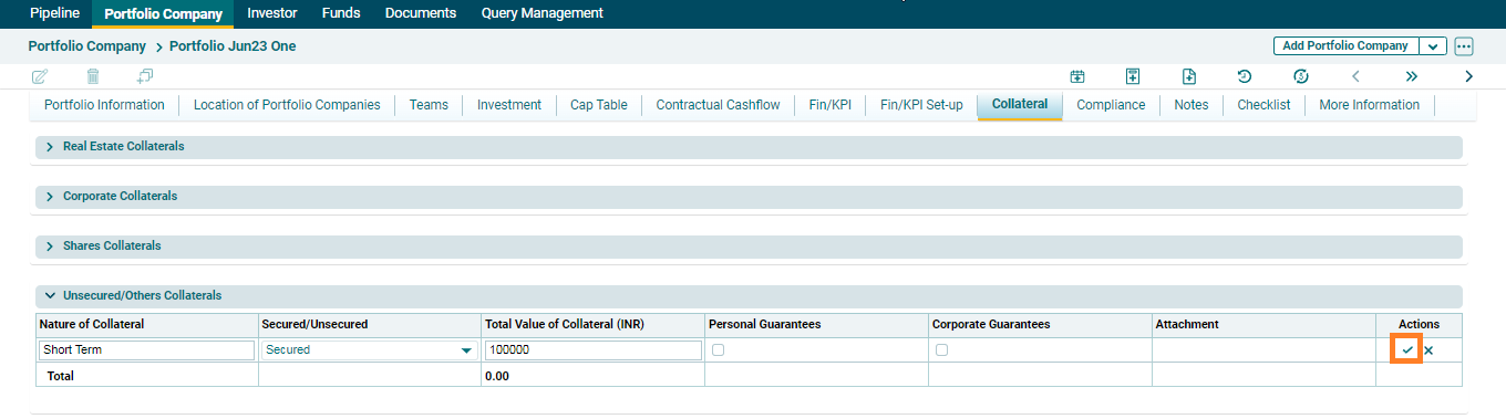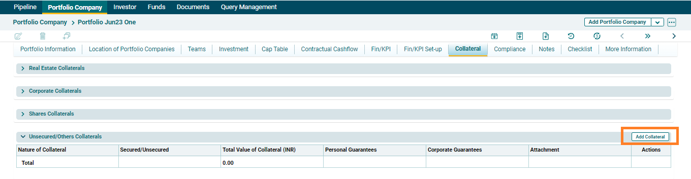 Unsecured/Others Collaterals panel allows you to track all unsecured or other collaterals associated with the portfolio company. The details included are: