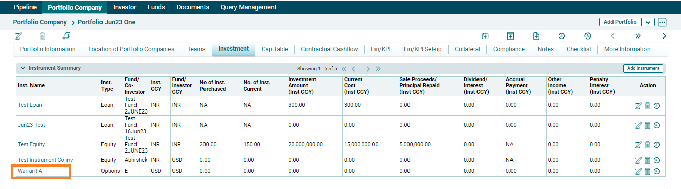 icon in the Actions column. The delete window is displayed. Click OK to delete the instrument