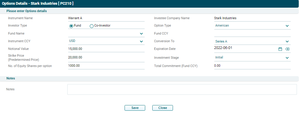 Instrument Type window is displayed. Select Options from the Instrument Type dropdown list. Click Proceed.
