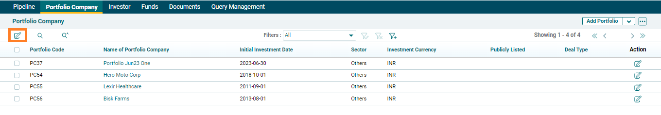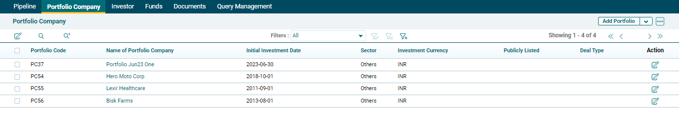 The default view of the portfolio company window is the List view. The following details pertaining to deals are visible in List View: