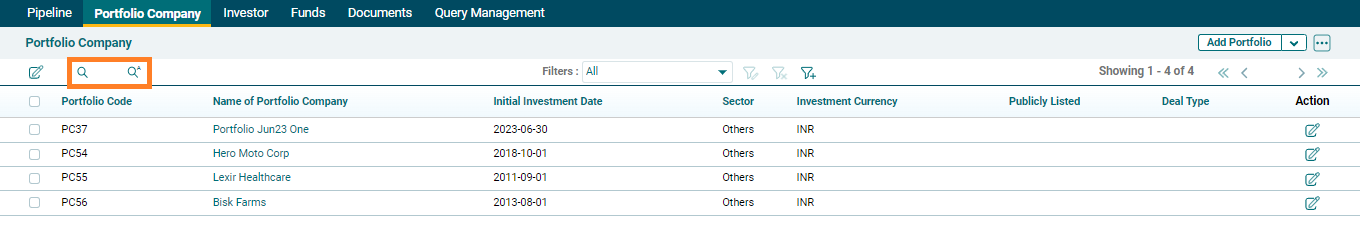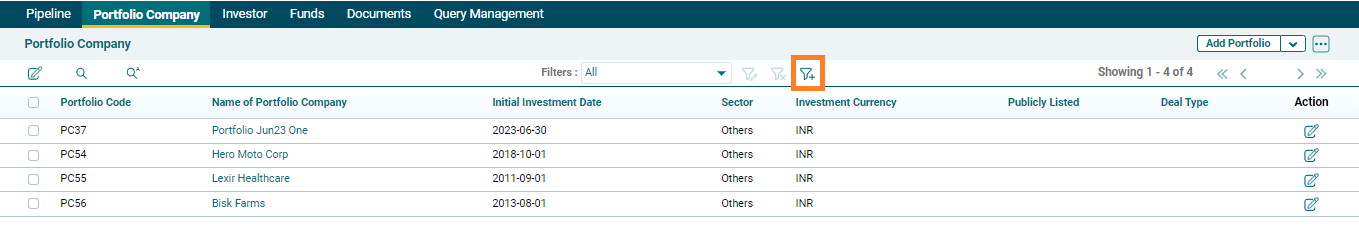 3. To filter the portfolio based on certain parameters, click on the Filter icon and define the custom view.