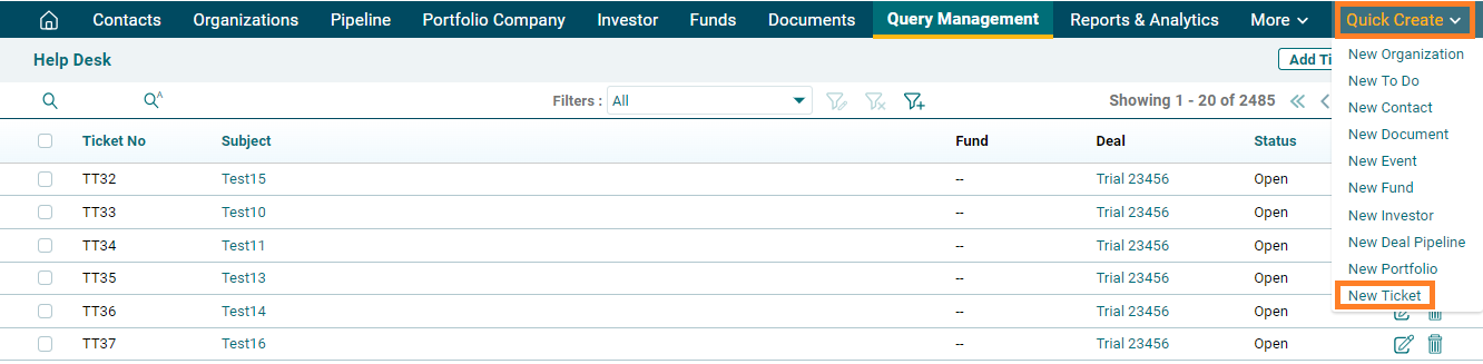 1. Click on Quick Create on the top panel, then navigate to New Ticket.