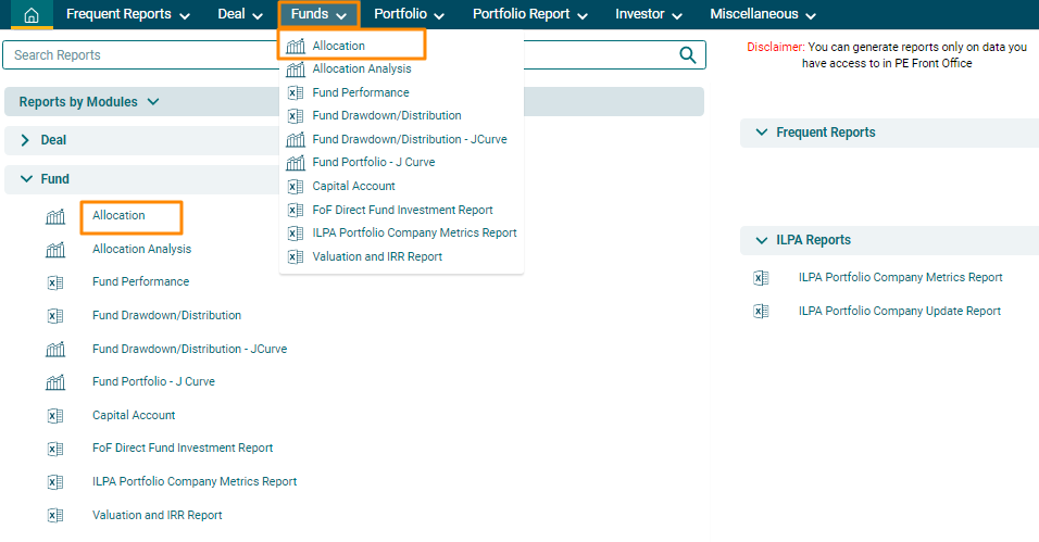 2. You can access the report from the dashboard by clicking Allocation in the Funds panel or from the Funds drop-down menu in the blue vertical bar.