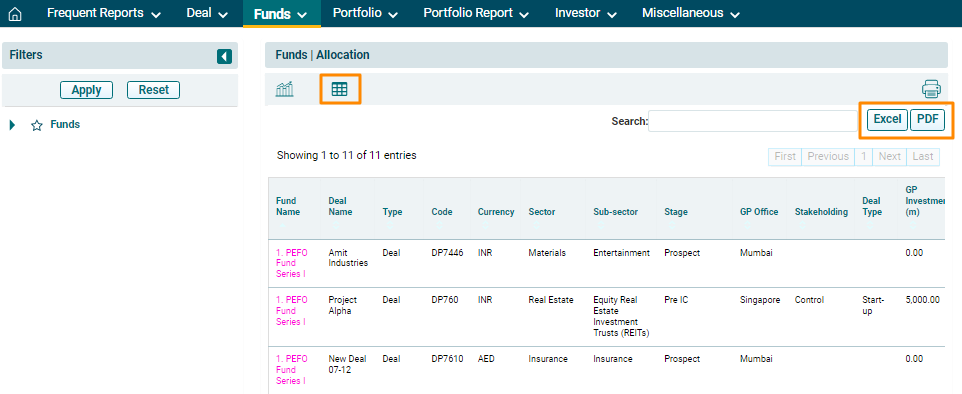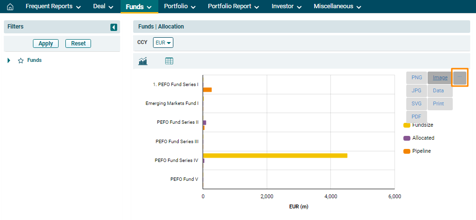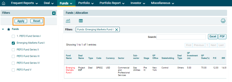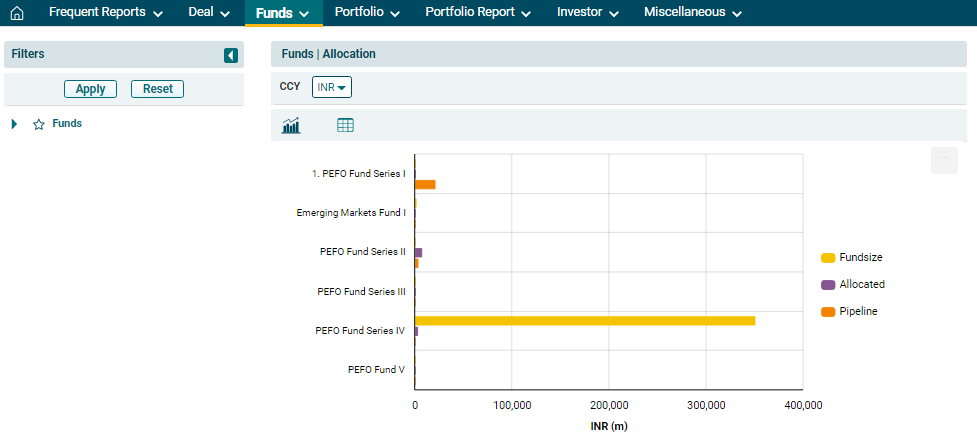 6. To further drill down into the analysis, use the filters on the left-hand side. Select the Fund and click on Apply. To reset the filters, click Reset.