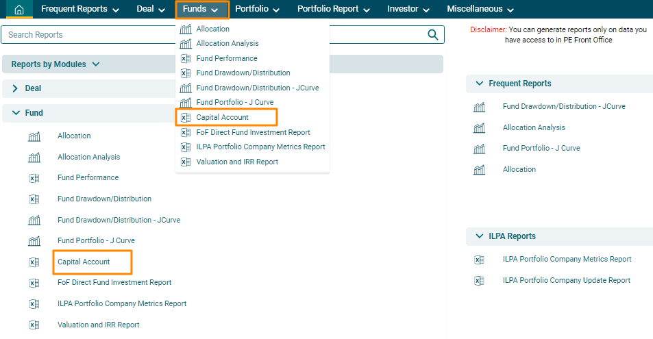 2. You can access the report from the dashboard by clicking Capital Account in the Funds panel or from the Funds drop-down menu in the blue vertical bar.