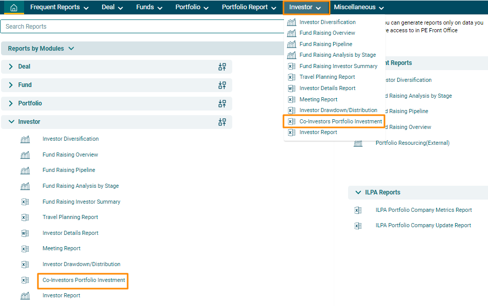 2. A new window is displayed. You can access the report from the dashboard by clicking Co-Investors Portfolio Investment in the Investor panel or from the Investor drop-down menu in the blue vertical bar.