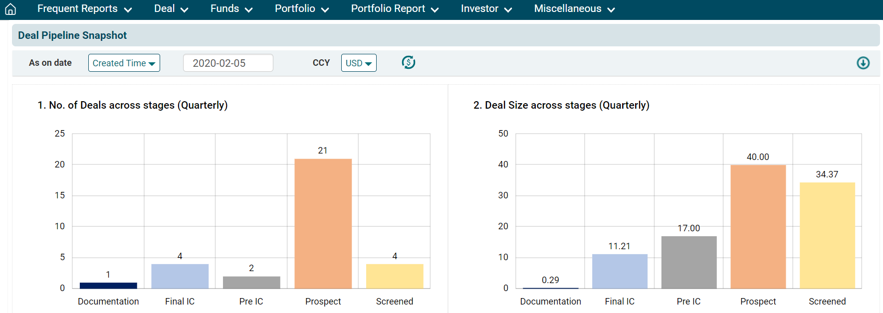 3. The Deal Pipeline Snapshot window is displayed. You can see six charts displayed. These charts depict: