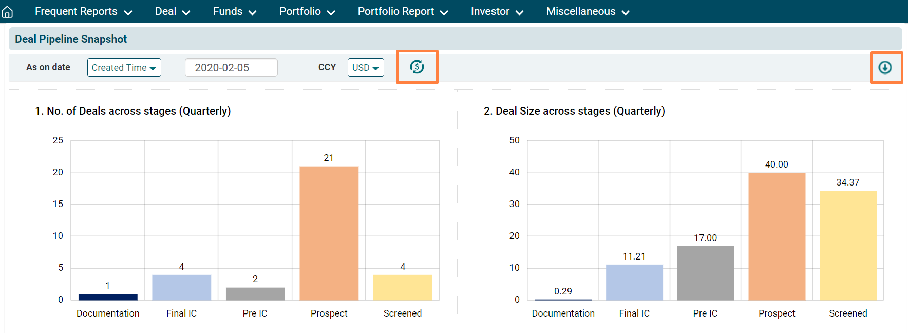 To view and download multiple charts containing details of all the deals, you can use the Deal Pipeline Snapshot.