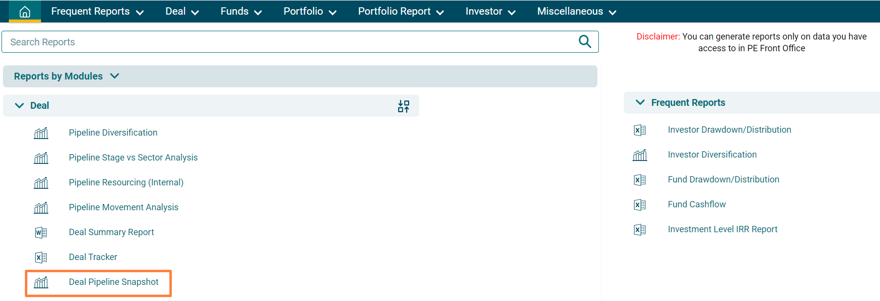 2. You can access the report from the dashboard by clicking Deal Pipeline Snapshot in the Deal panel or from the Deal drop-down menu in the blue vertical bar.