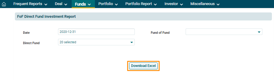 2. You can access the report from the dashboard by clicking FoF Direct Fund Investment Report in the Funds panel or from the Funds drop-down menu in the blue vertical bar.