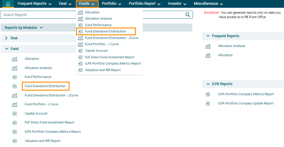 2. You can access the report from the dashboard by clicking Fund Drawdown/ Distribution in the Funds panel or from the Funds drop-down menu in the blue vertical bar.