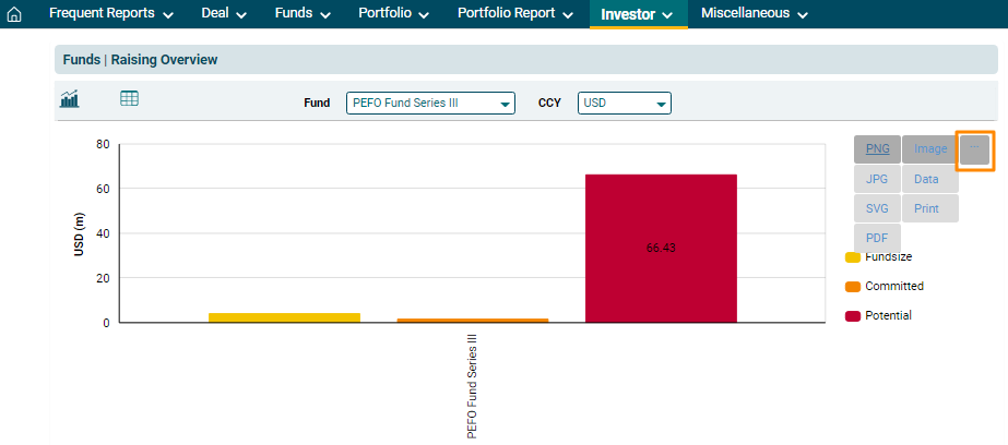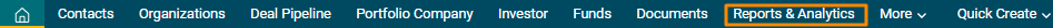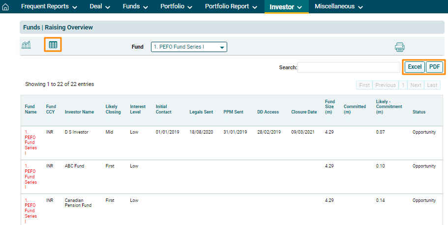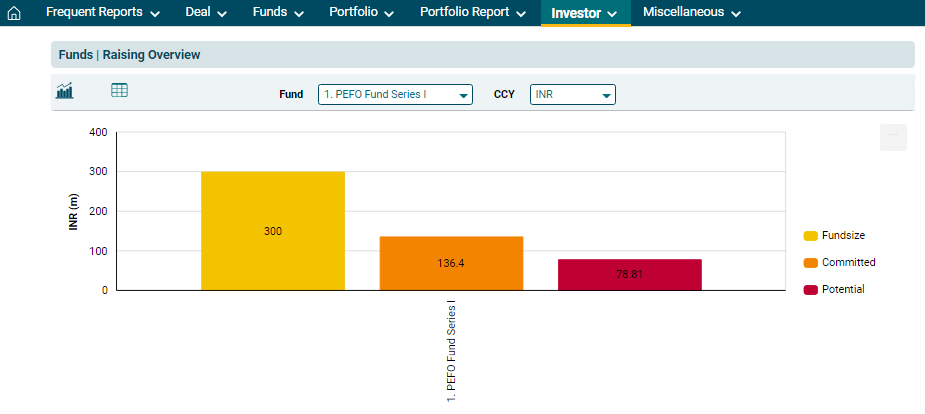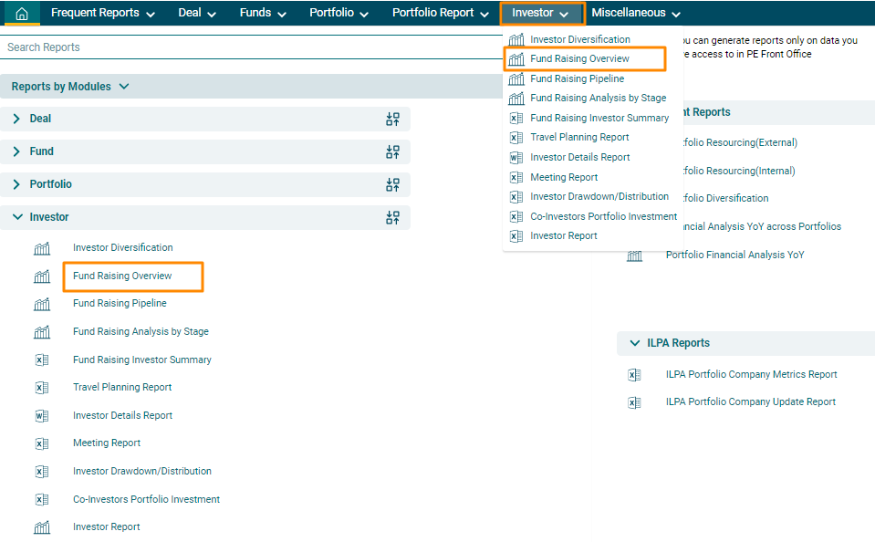 2. A new window is displayed. You can access the report from the dashboard by clicking Fund Raising Overview in the Investor panel or from the Investor drop-down menu in the blue vertical bar.