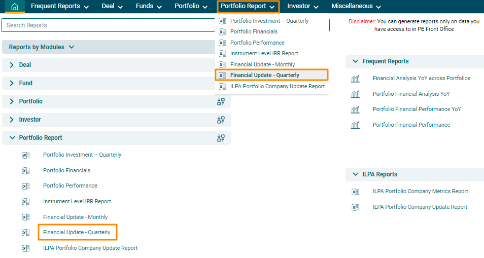 2. You can access the report from the dashboard by clicking Financial Update-Quarterly in the Portfolio Report panel or from the Portfolio Report drop-down menu in the blue vertical bar.