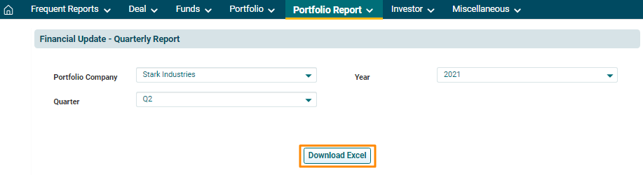 3. The Financial Update- Quarterly Report window is displayed. Choose the portfolio company from the drop down list. Specify the quarter for which you wish to download the report. Click on Download Excel button. The excel file will download.
