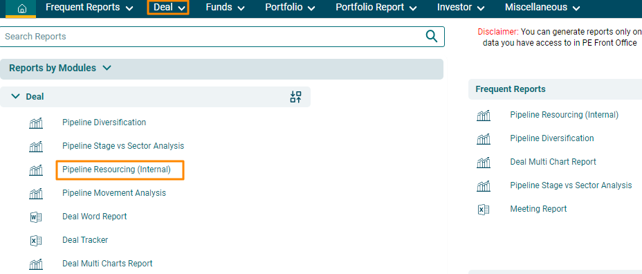 2. You can access the report from the dashboard by clicking Pipeline Resourcing (Internal) in the Deal panel or from the Deal drop-down menu in the blue vertical bar.