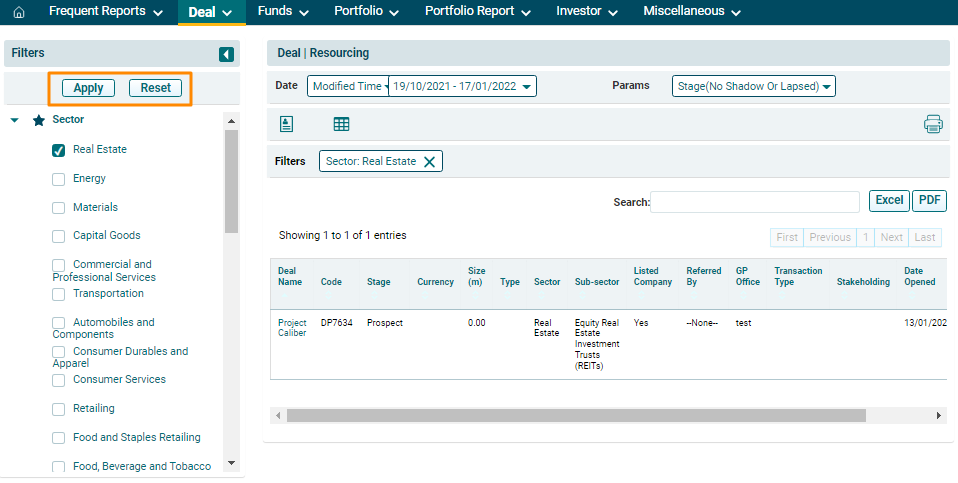6. To further drill down into the analysis, use the additional filters on the left-hand side. Select a filter and click on Apply. To reset the filters, click Reset.