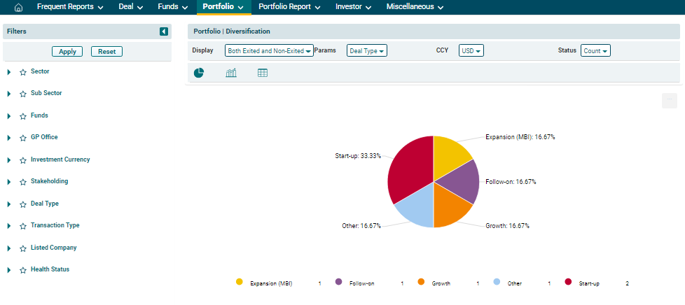 3. The Portfolio | Diversification window is displayed. It displays the data in the Pie Chart form based on the set parameters.