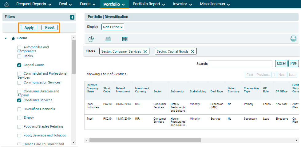 2. You can access the report from the dashboard by clicking Portfolio Diversification in the Portfolio panel or from the Portfolio drop-down menu in the blue vertical bar.