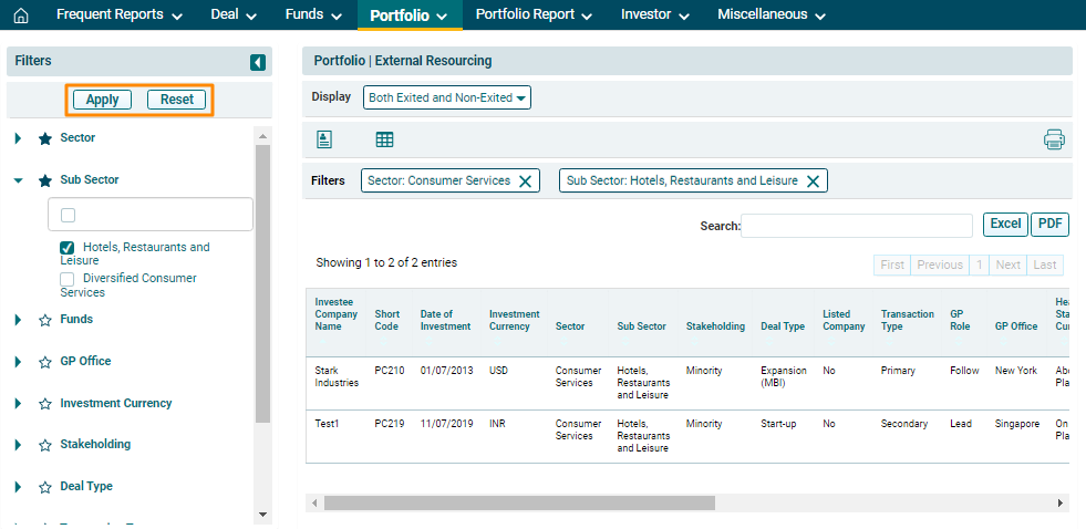 3. The Portfolio | External Resourcing window is displayed. It displays the data in the Deal Grid based on the set parameters.