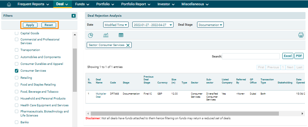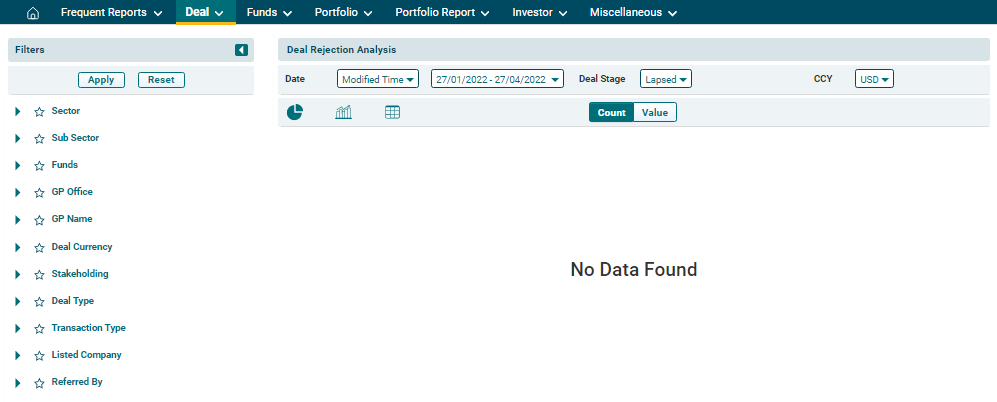 7. To further drill down into the analysis, use the additional filters on the left-hand side. Select a filter and click on Apply. To reset the filters, click Reset.