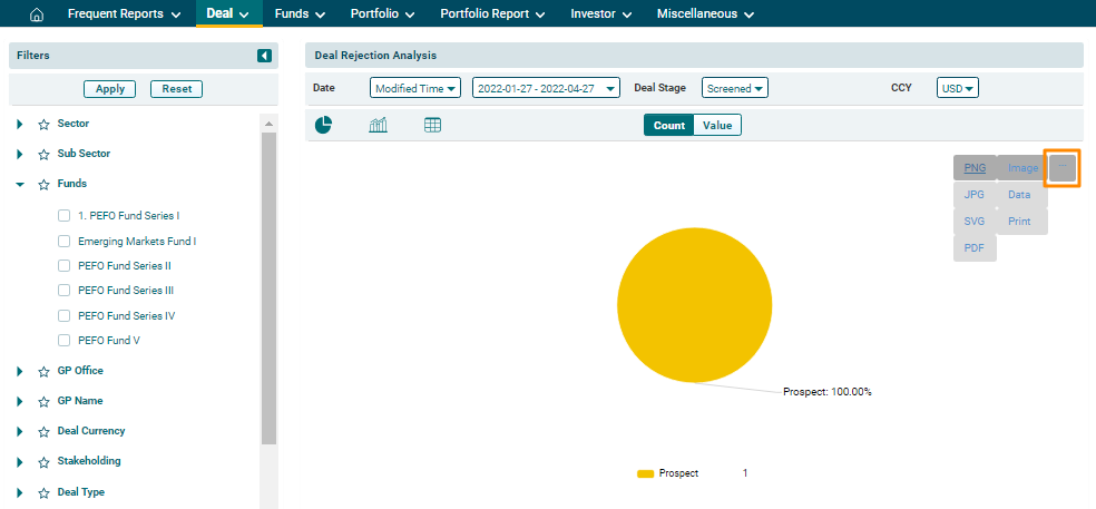 After applying the filters, you can view the chart based on the changed parameters. You can download the report in various formats. Click on the gray square box button in the top right corner near the graph. The report can be downloaded in image formats, such as PNG, SVG, JPG, etc., and data formats, such as JSON, HTML, PDF, CSV, etc. Click on a format and the report will be downloaded.