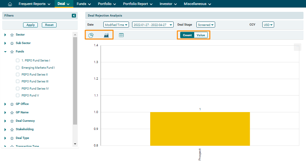 5. You can view the above data in Bar Graph and Pie chart. Click on the icons below the filters to view the diversification in the desired format.