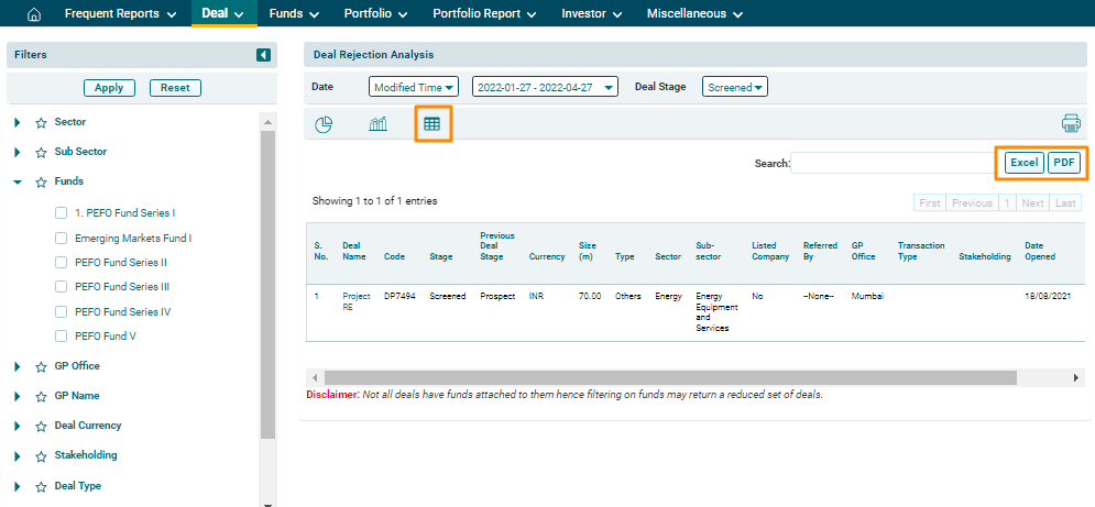 6. You can also view the underlying dataset for the above graphs. Click on the Data Set icon. You can download the dataset in Excel and PDF format. Click on the desired format to download.