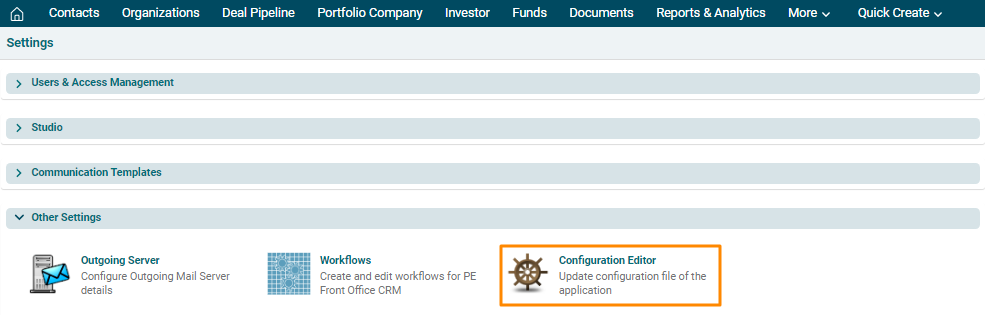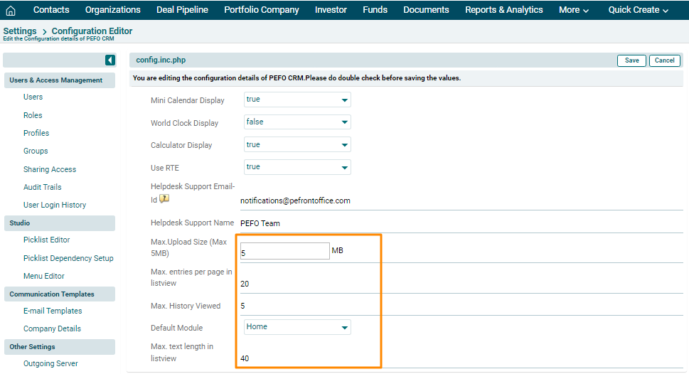- Default Module: Displays the default module where you will land when you open PE Front Office.