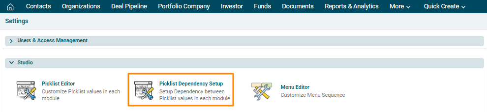 2. In the Studio panel, click on Picklist Dependency Setup.