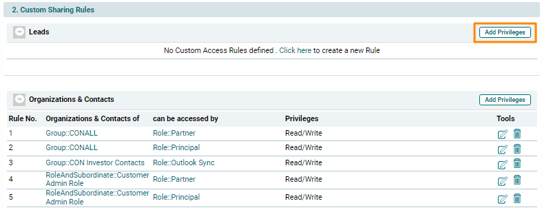 6. To delete a custom sharing rule, click on the Delete icon (