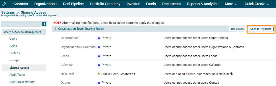 list of existing privileges will be displayed. Click on Change Privileges