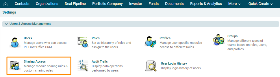 Sharing Rules enables you to configure following permissions across users in PE Front Office.